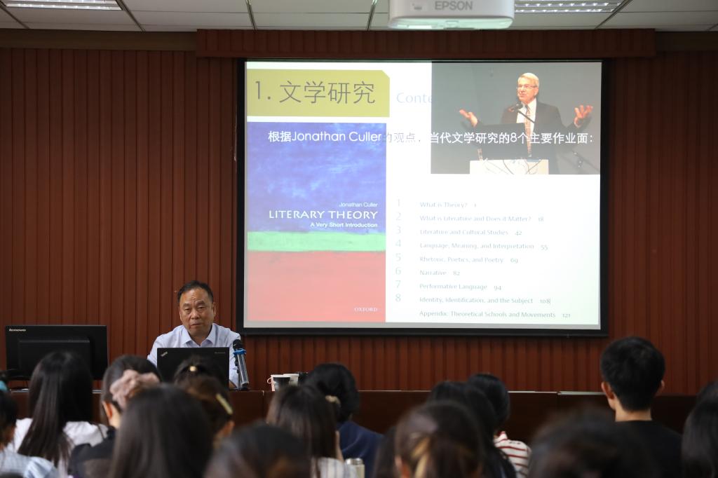 张教授首先从文学的内涵和功用出发,梳理了从古希腊时期起经由罗马时期直到20世纪的各类文学研究路径,在此基础上提出文学研究理应回归文本,深入细读才是文学研究的真途所在。随后,他以诺贝尔文学奖得主,美国诗人露易丝·格丽克的诗歌“Hyacinth”为例深入浅出地阐释了文本细读的基本方法。最后,张教授结合功能、结构、语言、引文等诸多要素全面讲述了学术论文撰写的规范和策略。本次讲座拓展了我院师生的文学研究视野,增强了大家对学术论文写作的认识,取得了良好的学术效果。
