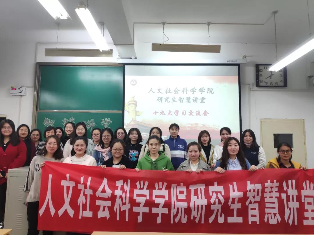 2019年3月26日,人文社会科学学院研究生智慧讲堂在13303H举行。本次智慧讲堂的主题是"做奋发有为,勇于担当的时代青年",主讲人为思想政治教育专业的张欣桐、可佳欣、夏睿渊和英语语言文学专业李郁凡、张娟、张伟娜。人文学院全体研究生参加了此次活动。