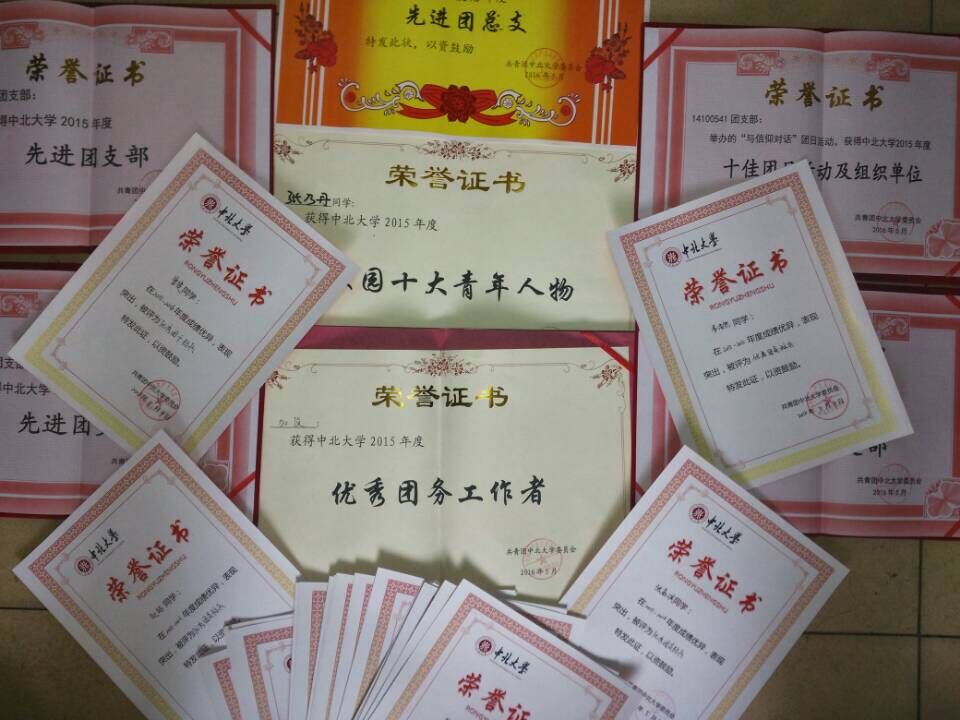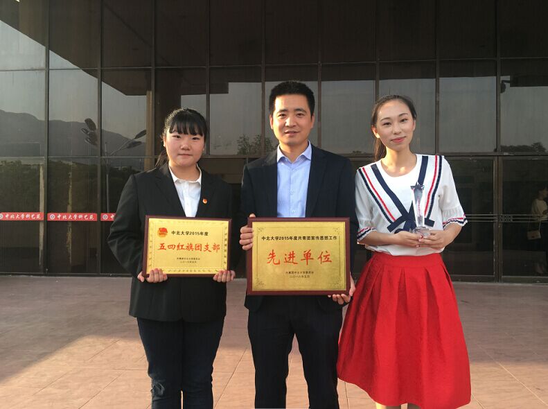 在本次中北大学“五四表彰”活动中,我院团委荣获“中北大学宣传思想工作先进单位”荣誉称号;第一团总支获评“先进团总支”荣誉称号;14100541团支部获评“五四红旗团支部”荣誉称号;14100141、14100542、15100341团支部获得“先进团支部”荣誉称号;张乃丹同学获得“中北大学十大青年人物”荣誉称号;院团委书记加俊老师获“优秀团务工作者”荣誉称号;曾楚同学获得“优秀团干标兵”荣誉称号;李浩然、张嘉琪、赵越三位同学获得“优秀团员标兵”荣誉称号;潘婷等13名同学获得“优秀团干”荣誉称号;何佳慧等26名同学获得“优秀团员”荣誉称号;另有马义强、苏鹏等多名同学获得“五四新闻奖”。