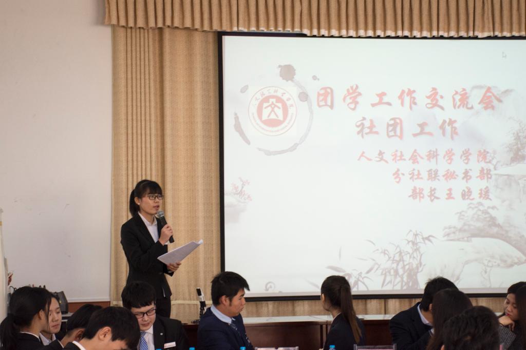加俊老师对山西工商学院传媒学院师生一行前来交流和考察表示热烈的欢迎,并对中北大学概况、学院概况和团学工作亮点进行了介绍。人文学院学生会主席徐洁同学介绍了学院在社团工作、社会实践、志愿服务、宣传报道等特色工作中的成果和思路。传媒学院学生会主席郭书昆向与会人员进行了整体团学工作介绍。人文学院团委学生会新媒体运营部、学习部、青志部、实践外联部、社团联合会分会学生干部上台展示了本部门的工作。传媒学院团委学生会新闻媒体部、组织部、创新设计部、秘书处、纪律部学生干部向与会人员介绍了部门工作。