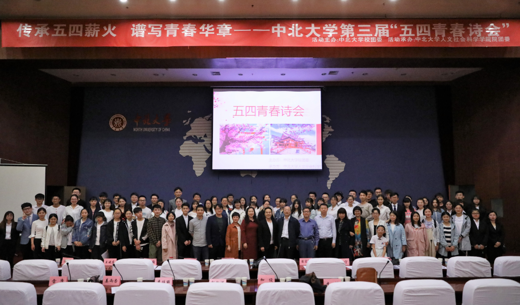 激情四月,青春飞扬,中华大地流光溢彩,中北校园生机盎然。在五四青年节即将到来之际,由校团委主办、人文社会科学学院团委承办的中北大学第三届“五四青春诗会”决赛在图书馆五层学术报告厅隆重举办。山西广播电视台专题部主播张宏斌、党委宣传部部长薛实军、人文社会科学学院党委书记雷丽蓉以及来自校工会、学生处、校团委、软件学院、艺术学院、环境与安全工程学院、人文社会科学学院、校电视台、广播站的领导、老师和学生担任决赛评委。