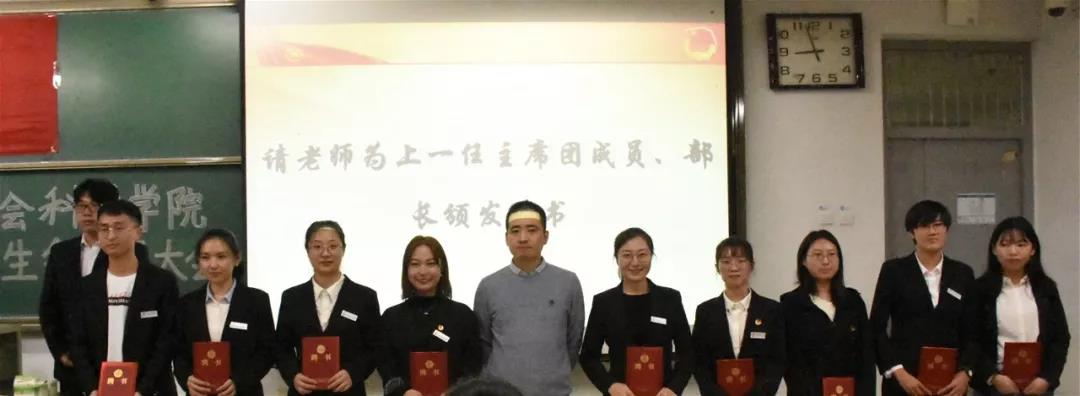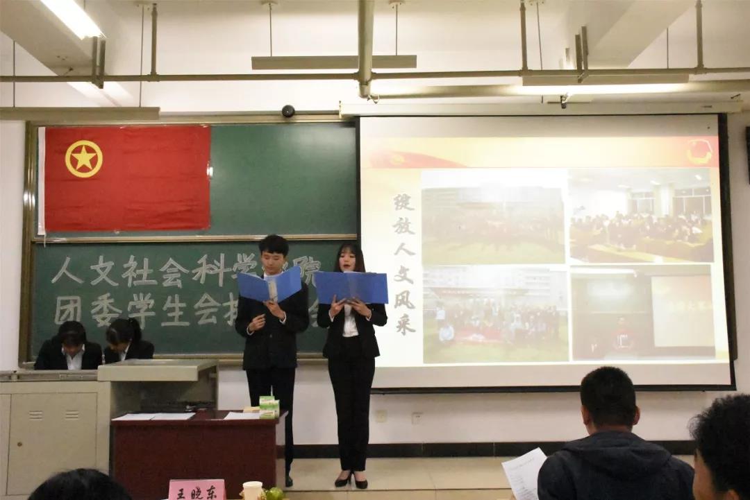 10月19日晚8点,人文社会科学学院团委、学生会换届大会在15109教室成功举办。院团委书记加俊、学生科孙梦瑶老师以及学院第二届第七任、第八任团委、学生会全体学生干部及各班班委参加此次大会。
