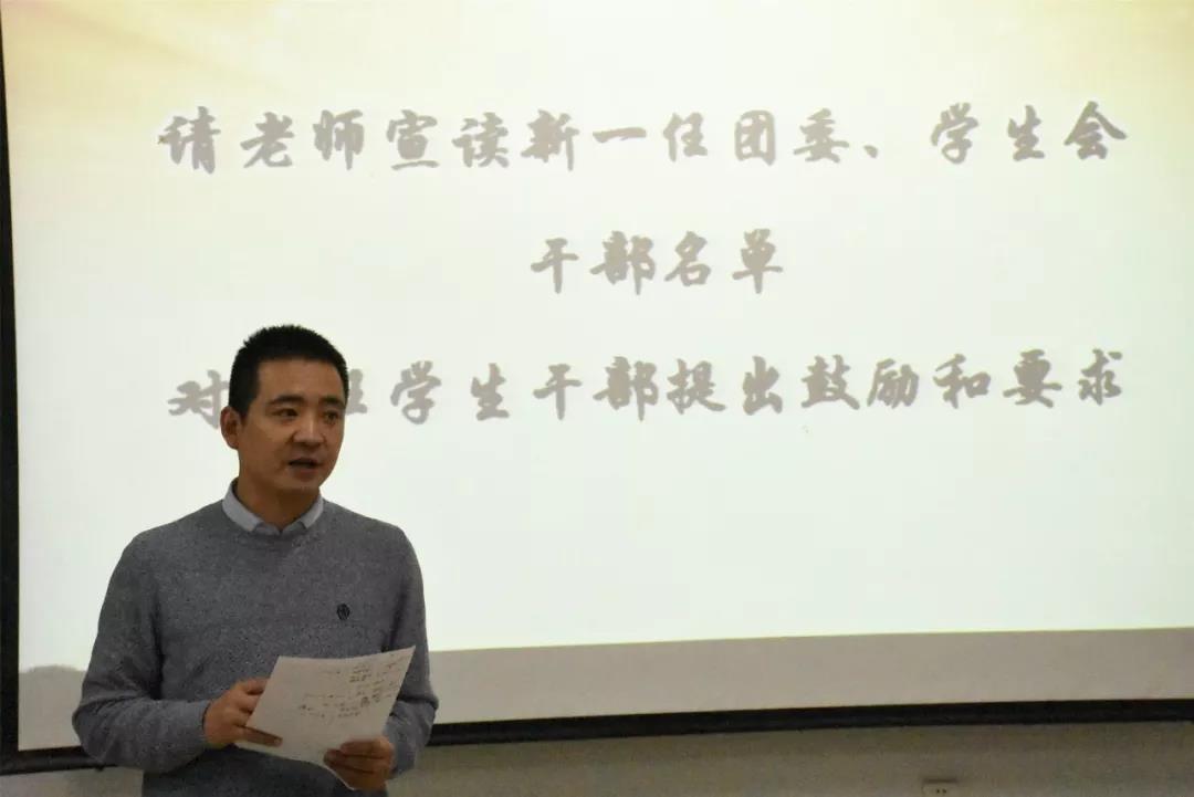加俊老师宣读新一届团委、学生会学生干部名单,对新任团学干部表示鼓励,并为上一届团委、学生会主席团及各部负责人颁发聘书,为上学年团委、学生会优秀部门和优秀班委颁奖