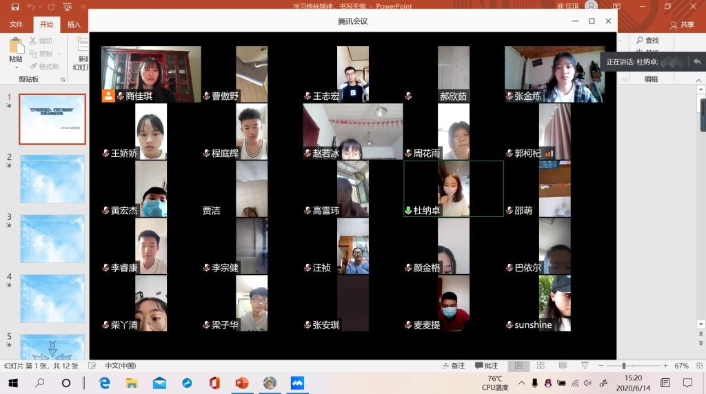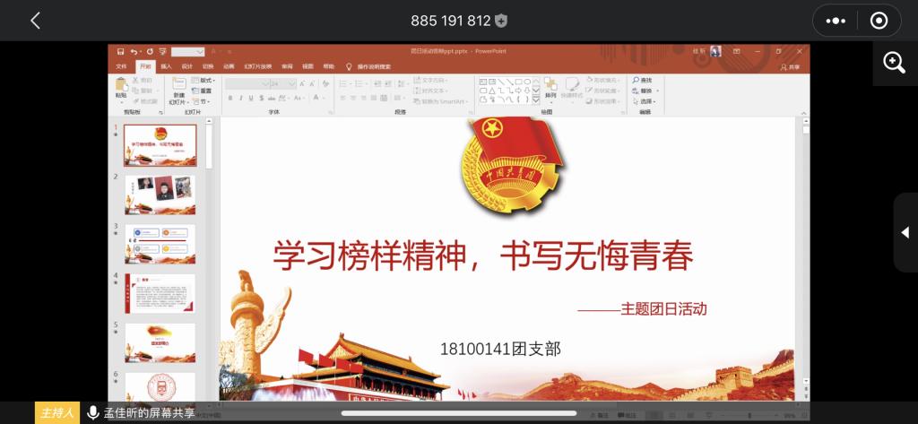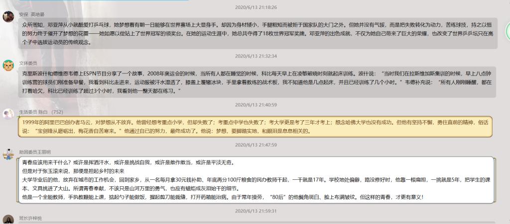 19100142团支部的同学们在团日活动后说到,本次团日活动以“学习榜样精神,书写无悔青春”为主题,旨在提高19100142团支部成员们的看齐意识,增强榜样力量。本次活动采取线上活动的形式,利用腾讯会议及学习通APP开展。成员们都积极参与,踊跃发言。在交流中,成员们感受到支持唐珊奋战在抗疫前线的坚定的信念,更感悟到一个共产党员的担当,感悟到“手撕钢”创新研发团队的不懈奋斗,更感悟到榜样的力量。相信活动后,支部成员们将努力向榜样看齐,书写属于自己的无悔青春!