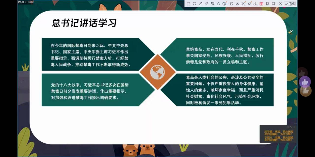 学院以党支部、团支部为单位,组织召开以“6.26国际禁毒日”为主题的学习研讨活动,根据在直播课中所讲述的禁毒知识,围绕“什么是毒品”“吸毒为什么会成瘾”“吸毒有哪些危害”等方面进行交流与分享,并且对“怎样正确对待吸毒者”“青少年应如何自我防范和保护”等方面进行深入讨论。通过学习讨论,更好地认识到了禁毒的重要意义,内化了学习成果,对禁毒工作的了解进一步加深。