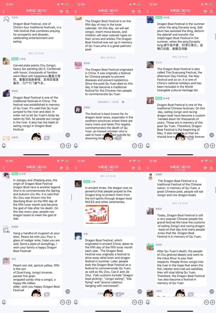 各团支部创新活动方式,18100241团支部通过讲述端午故事,开展端午知识大比拼的竞赛等形式,进一步增强了同学们对传统文化的认识以及热爱。18100242团支部将支部成员们分组进行了端午节传统主题交流,各组之间互谈交流感受。19100242团支部团支书在中国网找到介绍端午节和传统文化的英文短片,支部成员观看短片后用英语讲述传统文化和端午节的相关知识。