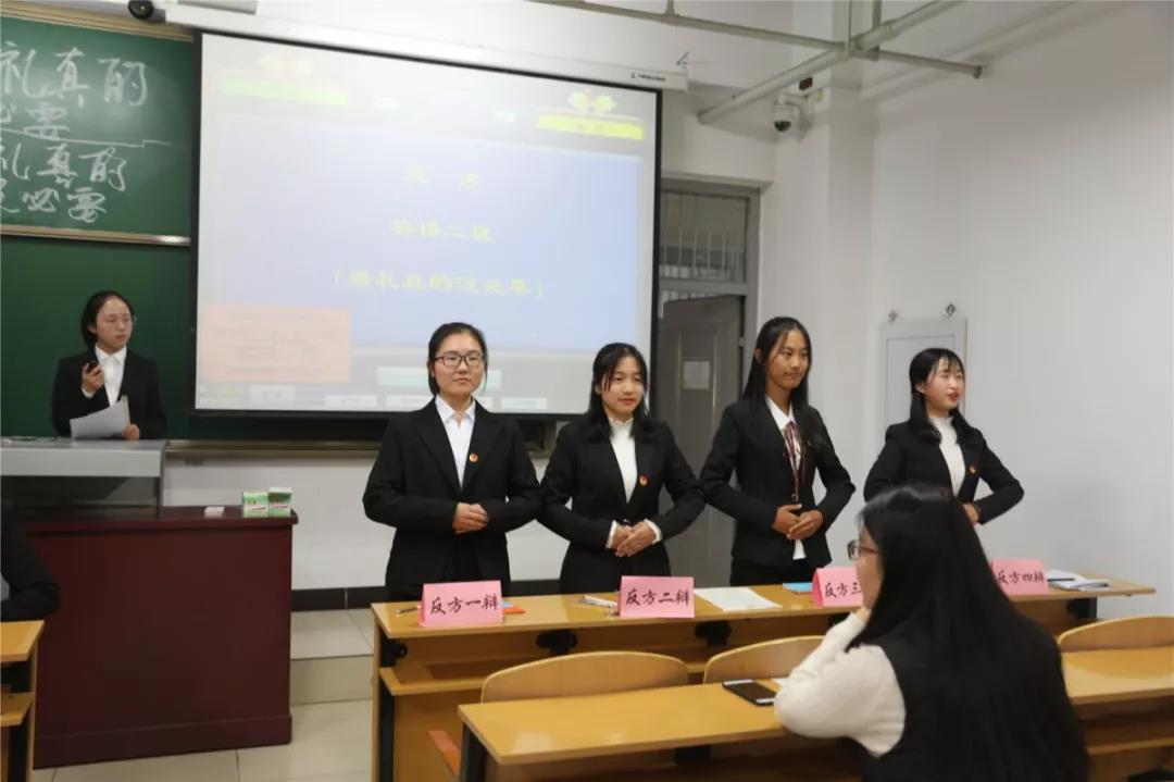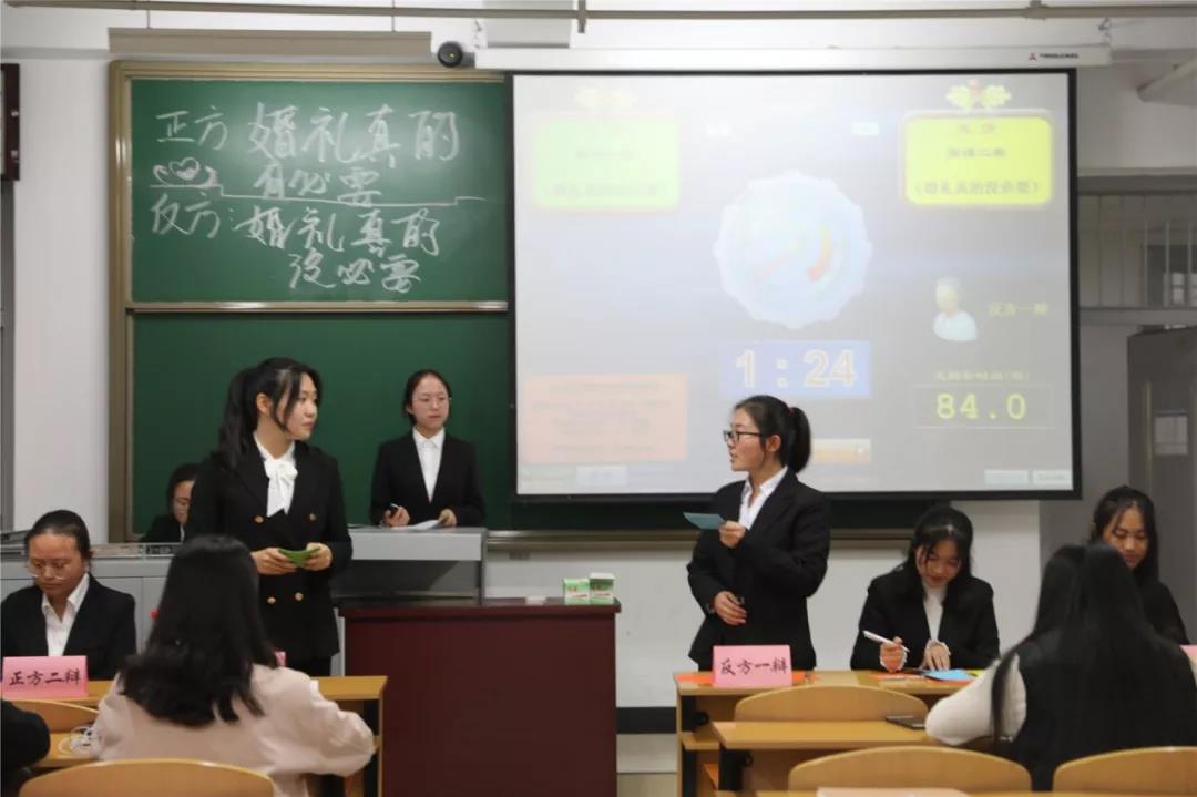比赛在双方的自我介绍中拉开了帷幕。随着比赛的进行,双方的问答交互越来越激烈。场上双方你来我往,围绕“婚礼有没有必要”和“遇险时伴侣逃跑是否原谅”这两个辩题展开辩论,在没有硝烟的语言战场上短兵相接,智者胜。尽管辩论激烈,比赛在主持的引导下有序进行,场上双方争论激烈却依然不失风度,尊重对方的观点,作君子之争,以理服人,以智压人。辩手们良好的风范、出色的口才、敏捷的思维令听者折服。现场的氛围也随着自由辩论顿时达到高潮。总结陈词环节,双方四辩分别阐述各方系统观点并补充。经过激励的比拼,最终还是19100141、19100242、19100243、19100342四支队伍获得了比赛的胜利。