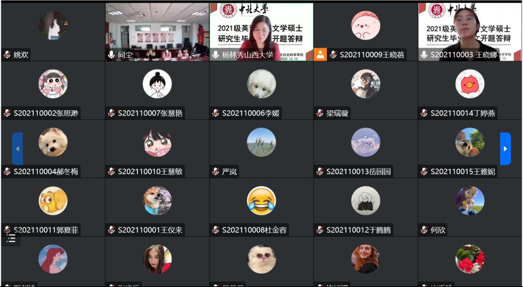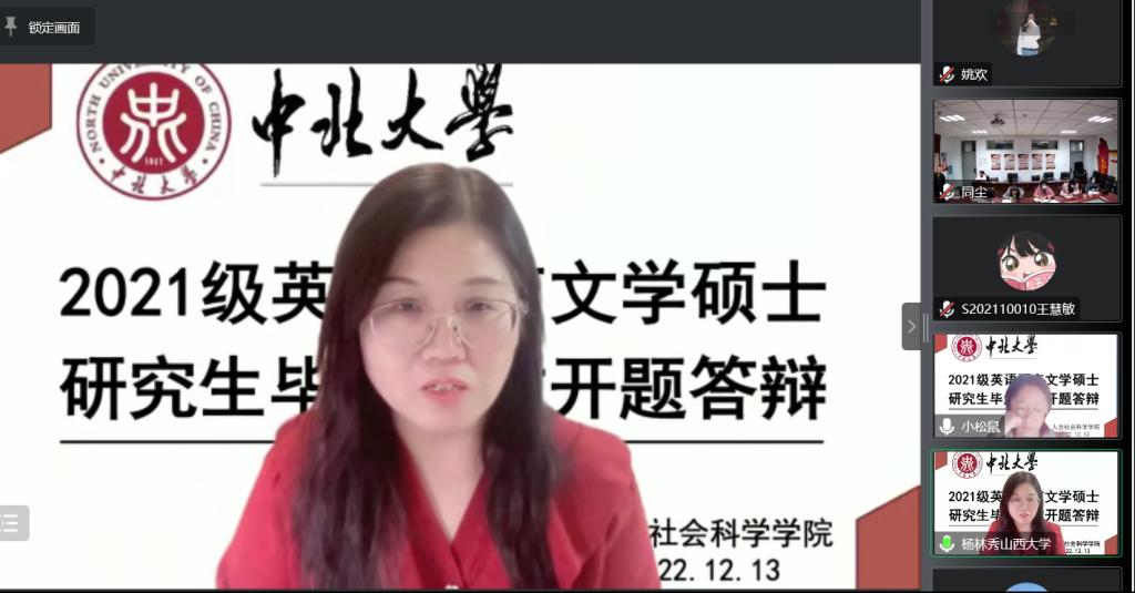 2022年12月13日下午,我院举行了2021级硕士研究生学位论文开题答辩会议。按照学校疫情防控工作要求,本次答辩会通过腾讯会议线上举行,我院英语语言文学专业研究生导师及2021级全体硕士研究生参会。本次答辩会特别邀请了山西大学外国语学院副院长杨林秀教授担任评审组组长,2022级全体硕士研究生全程线上观摩。会议由外语系主任李兵绒老师主持。