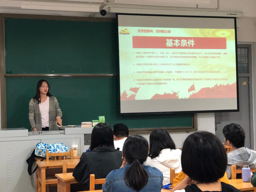 在入党知识培训会中,学生党员从自身对党的认识、介绍党的光辉发展历程、入党流程、大学生入党条件、入党申请书的写作规范等几个方面进行了生动的讲解。学生党员们向大一新生阐述了共产党人的理想信念与价值追求,强调了入党积极分子树立理想信念的重要意义,希望同学们时刻牢记党的宗旨,勇于担当时代责任,模范践行社会主义核心价值观,为实现中华民族伟大复兴的中国梦贡献青春和力量。