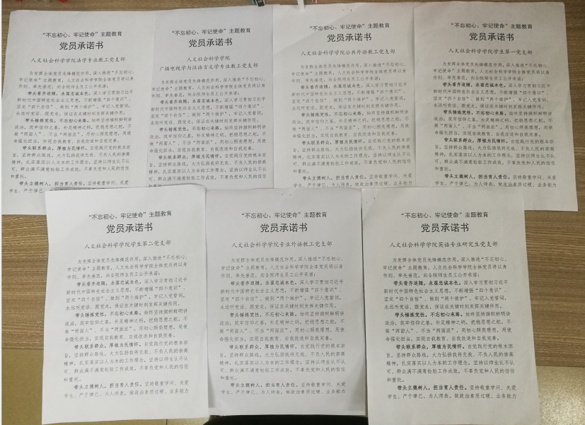 为扎实推进“不忘初心 牢记使命”主题教育工作,强化学院教职工党员和学生党员的责任意识和服务意识,引导党员同志发挥先锋模范带头作用,根据《中北大学“不忘初心 牢记使命”主题教育工作方案》要求,结合《中国共产党党员教育管理工作条例》相关精神,人文社会科学学院党委精心谋划,统一制发《“不忘初心、牢记使命”主题教育党员承诺书》,安排学院各党支部组织党日活动,开展党员承诺践诺工作。